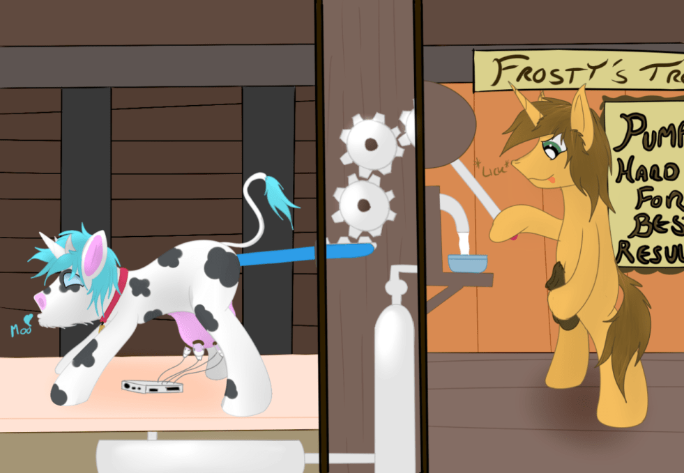 If any of the former mare remained in Circuit then, it was soon washed away by the constant pleasure of her udder being emptied “Good, now with two new cows on board we might be able to catch up on our quota my father slowed us down on. Well done Circuit you’ve done so much for us!” All Sweet got was a content moo from Circuit “Yes… You can stay in the machine ALL night if you want… Have fun.”