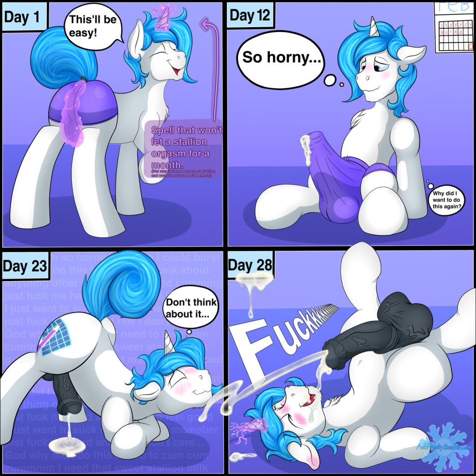 “I can see your blush from here, Pegapet. Your ears look like they’re practically burning up,” the unicorn whispered. Composing another chorus of melodious moans, Frost Bright conducted his new instrument by stroking and rubbing Wing’s flanks. His hooves wandered to fondle the subby’s balls, and the artist made sure Wing heard his teasing snicker over all those needy wails.